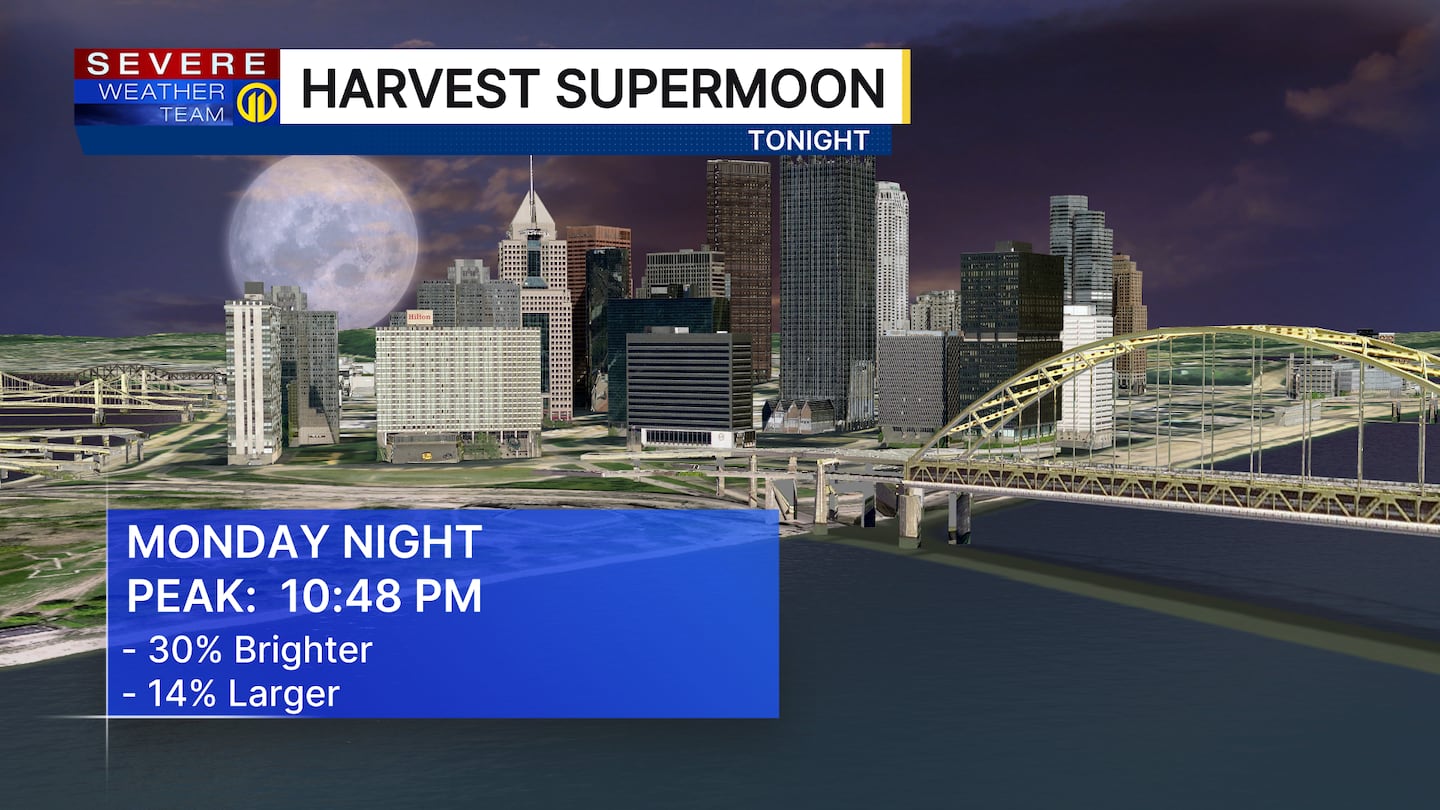 PITTSBURGH — If you’re lucky, you could catch a glimpse of the full Harvest Supermoon Monday night.