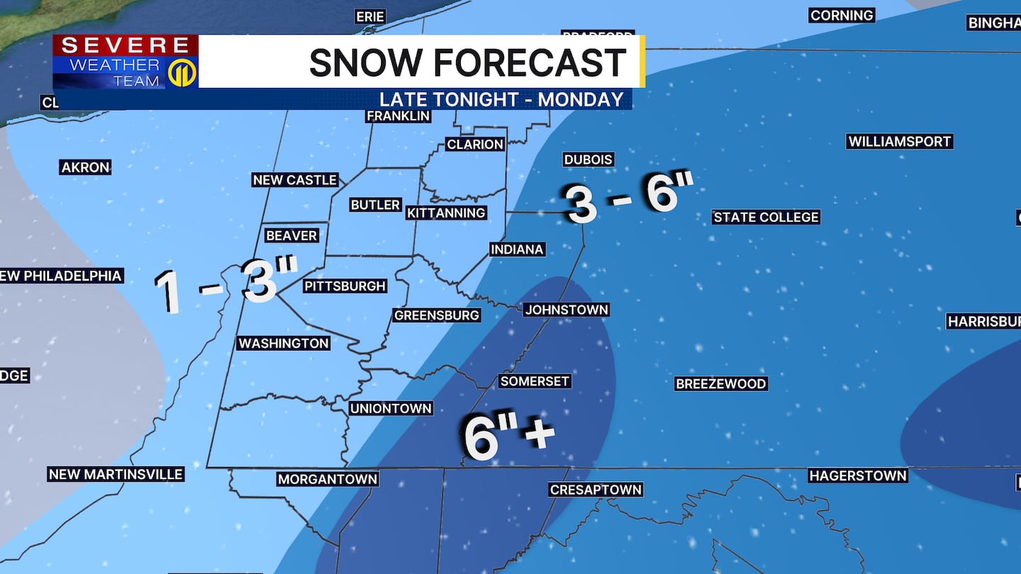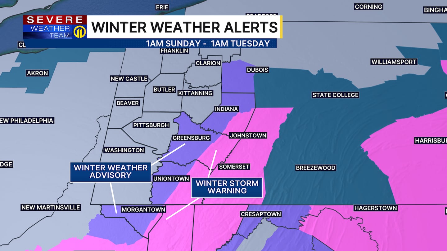A Winter Weather Advisory will be in effect in western Westmoreland, Indiana, Fayette, and Monongalia counties from 1 a.m. Sunday through 1 a.m. Tuesday. A Winter Storm Warning will be in effect for the ridges of Westmoreland, Fayette, Indiana and Monongalia counties, along with Preston, Tucker and Garrett counties from 1 a.m. Sunday through 1 a.m. Tuesday.